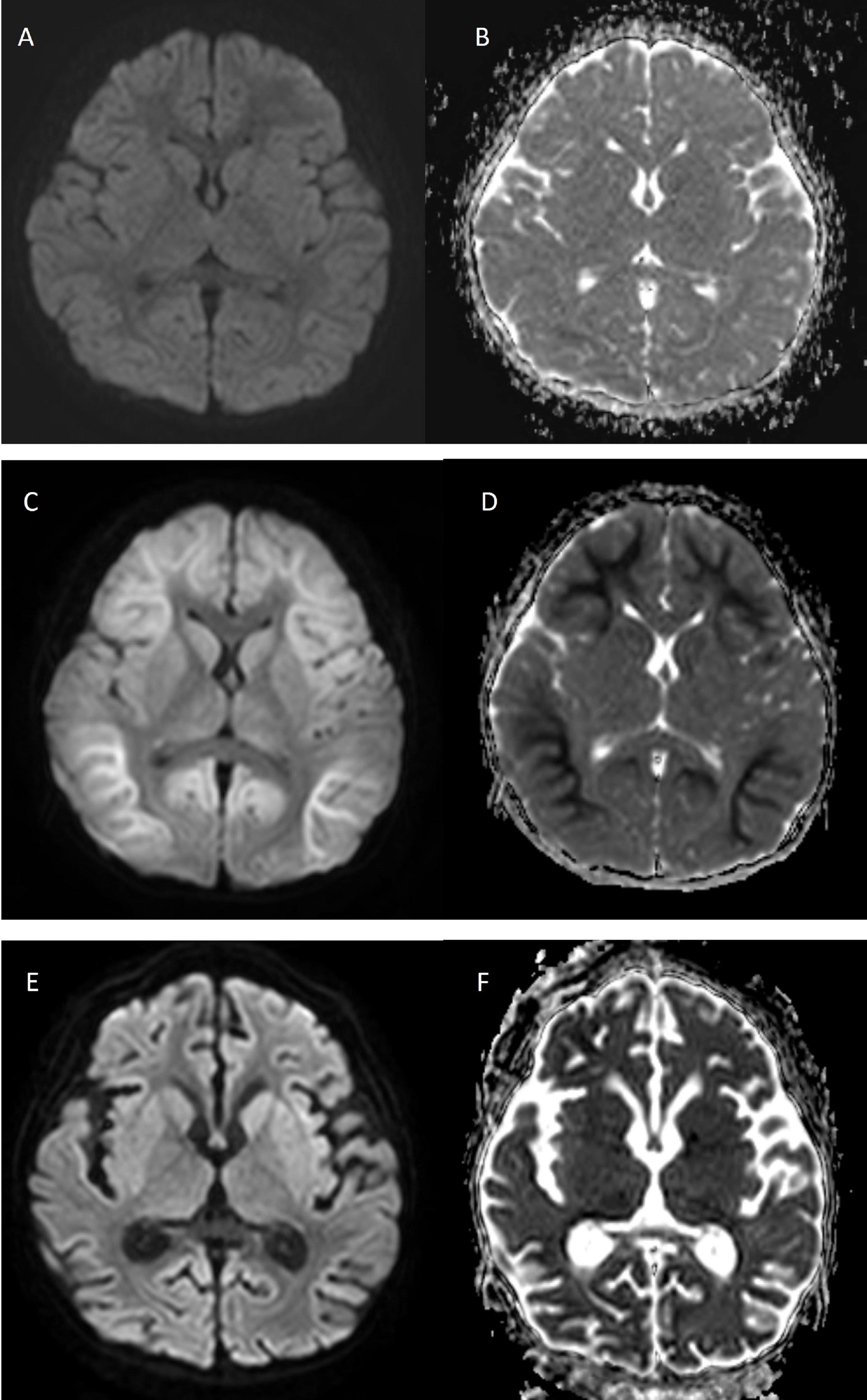Rationale: Acute encephalopathy with biphasic seizures and late reduced diffusion (AESD) is a subtype of acute encephalopathy described in a cohort of Japanese children. It is characterized clinically by biphasic seizures and late reduced subcortical diffusion on magnetic resonance imaging (MRI). Reports of AESD involving other ethnic groups are rare, as are those with a preceding adenovirus infection. We report the first Korean case of AESD in association with preceding adenoviral infection. Methods: We present clinical, electroencephalographic and radiologic features of our rare case. Results: A previously healthy 3-year-old Korean girl presented with statue epilepticus that started with focal impaired awareness with upward eye deviation following a 5-day prodromal illness consisting of fever, cough, sputum production, and rhinorrhea. Her seizures were refractory to typical doses of benzodiazepines but were subsequently controlled with a bolus of intravenous phenobarbital. Her chest radiograph showed pneumonic consolidation of the right lower lung field. Blood, urine, and CSF cultures showed no growth, and CSF polymerase chain reaction (PCR) for enterovirus, herpes simplex virus type 1 and 2, varicella zoster virus, cytomegalovirus, measles, HHV-6, and adenovirus was negative. However, multiplex real-time reverse transcriptase PCR assay for respiratory viruses from a nasopharyngeal aspirate was positive for human adenovirus. Initial brain MRI with diffusion-weighted imaging (DWI) and electroencephalography (EEG) showed no abnormality on day 3 of hospitalization (Figure 1A & 1B). After 5 days, she developed a second cluster of seizures followed by altered consciousness, aphasia, stereotypic movement, and developmental regression. Her seizure was controlled with levetiracetam. Her brain MRI showed symmetrical and extensive restricted diffusion in the subcortical white matter, which finally resulted in global brain atrophy, consistent with AESD (Figures 1C & 1D). Approximately 1 month later, she regained her gross motor functions. However, her brain MRI showed diffused atrophic changes involving both cerebral hemispheres (Figure 1E & 1F). One year later, she still showed psychomotor developmental regression and focal epilepsy, with diffused parenchymal atrophy without any interval change on brain MRI. Conclusions: We report what is, to our knowledge, the first case of a Korean child presenting with AESD preceded by adenoviral pneumonia. However, many cases with AESD might be missed because MRI abnormality is not seen for a few days. The diagnosis of AESD is based on the presence of biphasic seizures, and distinctive imaging features. Brain MRI with DWI is an essential tool to detect this type of encephalopathy in a patient with febrile status epilepticus who is showing repetitive seizures or neurologic deterioration. Therefore, pediatric neurologists should be aware of the clinicoradiologic features of acute encephalopathy and perform brain MRI aggressively in patients suspected of having AESD, to detect the dynamic MRI changes. Funding: None