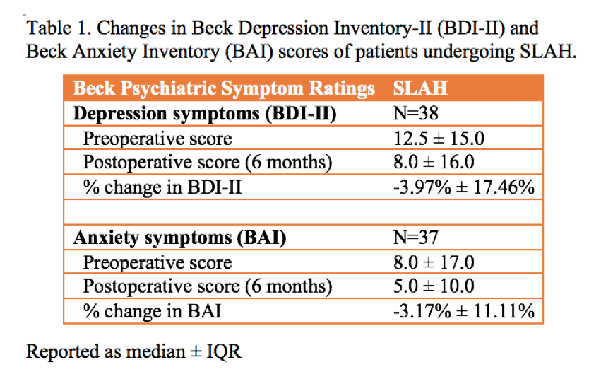 Rationale: Stereotactic laser amygdalohippocampotomy (SLAH) is a minimally invasive surgical treatment for medically refractory medial temporal lobe epilepsy (MTLE) that has comparable rates of seizure freedom to traditional resective MTLE surgery. The psychiatric outcomes of epilepsy surgery need to be considered due to the high overall prevalence of psychopathology in epilepsy patients. Though psychiatric outcomes after resective epilepsy surgery have been frequently examined, the current study is the first to describe psychiatric outcomes after SLAH. The objective of this study was to (1) determine the changes in depression and anxiety in MTLE patients after SLAH; (2) identify patient characteristics associated with worsening depression or anxiety following SLAH; and (3) determine the prevalence of de novo psychopathology after SLAH. Methods: Medical records of 38 MTLE patients undergoing SLAH between 2011 and 2016 were retrospectively reviewed focusing on Beck Psychiatric Symptom Scales (Beck Depression Inventory-II [BDI-II] and Beck Anxiety Inventory [BAI]) preoperatively and 6 months following surgery. Two-tailed Wilcoxon signed-rank tests were used to determine whether there were significant changes in depression or anxiety symptoms after surgery. Beck scores were then dichotomized into worse symptoms (postoperative score - preoperative score > 0) or same/better symptoms (postoperative score - preoperative score = 0) following SLAH. Pre-surgical seizure characteristics, postoperative seizure outcome, psychiatric history, and medication use were identified. Univariate association analyses were conducted to identify variables associated with worse depression or anxiety symptoms following SLAH. The prevalence of de novo psychopathology following SLAH was determined by evaluating how many patients with no pre-surgical lifetime psychiatric history were taking psychotropic medications postoperatively. Results: Our study demonstrated an overall 4.5 point median decrease in BDI-II scores (p = 0.15) and 3.0 point median decrease in BAI scores (p = 0.03) following SLAH (Table 1), yet 14 patients (37%) experienced worse depression symptoms and 9 patients (24%) had worse anxiety symptoms. Younger age (p = 0.08) and a pre-surgical history of secondarily generalized tonic-clonic seizures (p = 0.06) were associated with worse depression after surgery. There was no relationship between laterality of surgery, seizure freedom, or lifetime psychiatric history and depression or anxiety outcomes. Two of 17 (12%) patients with no lifetime psychiatric history developed de novo psychopathology following SLAH. Conclusions: This study is the first to evaluate psychiatric outcomes after SLAH. SLAH may improve overall psychiatric symptoms, similar to traditional resective MTLE surgery, but de novo psychopathology and postoperative psychiatric morbidity remain significant issues. Further investigation is required to identify patients at risk for psychiatric morbidity following SLAH. Funding: Not applicable