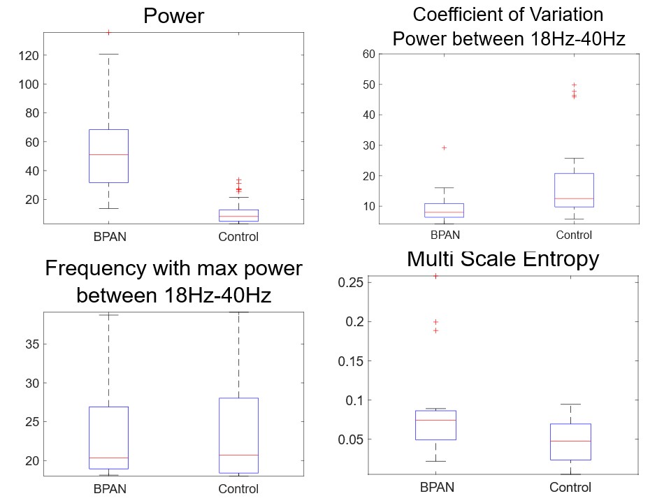 We analyzed 21 data from 9 children with BPAN. As a control group, we used 40 data from age-matched female recorded at Nagoya University Hospital. In control group, none of the patients were diagnosed as epilepsy or receiving anti-seizure medications. The most common reason for undergoing EEG among these patients was pre- or post-treatment evaluation related to intensive therapy of hematological diseases such as hematopoietic stem cell transplantation. Sampling frequencies of EEG ranged from 200 to 500 Hz. To minimize contamination of motion artifacts, EEG records during sleep were used. We computed the average power across all channels, the power spectrum and the multiscale entropy (MSE) of EEG from 18Hz to 40Hz, which indicate the scale of amplitude, the distribution of frequency and complexity of waveform, respectively.