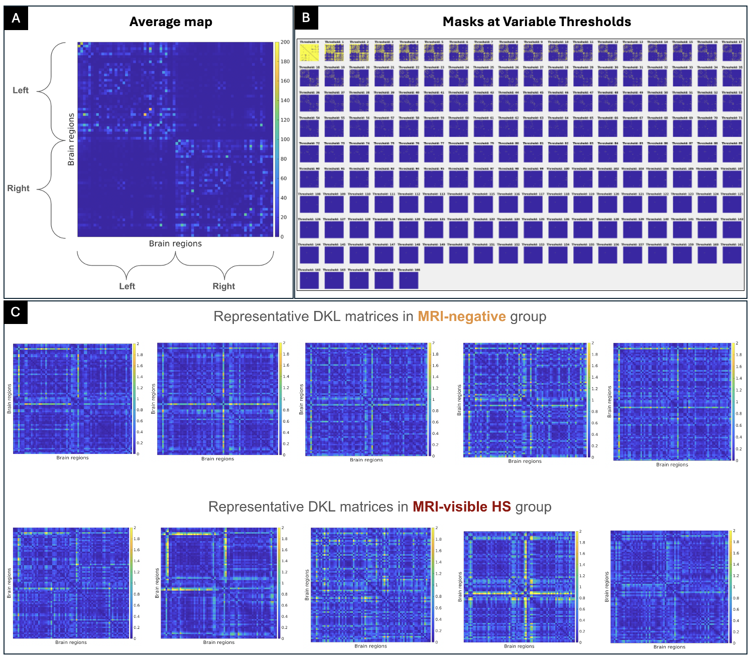 We evaluated metabolic networks using diffusion MRI-guided structural masks. These masks were derived from the average diffusion count connectivity matrix across all MTLE patients (Fig 1A), with connections above a given threshold retained at each level (Fig 1B). The resulting binary masks were applied to metabolic connectivity matrices computed using the Kullback-Leibler Divergence (DKL) method from FDG-PET scans (Fig 1C). Network metrics assessed included weighted global efficiency (GE) and weighted characteristic path length (CPL). Between-group comparisons were performed after regressing out the effects of age and gender.