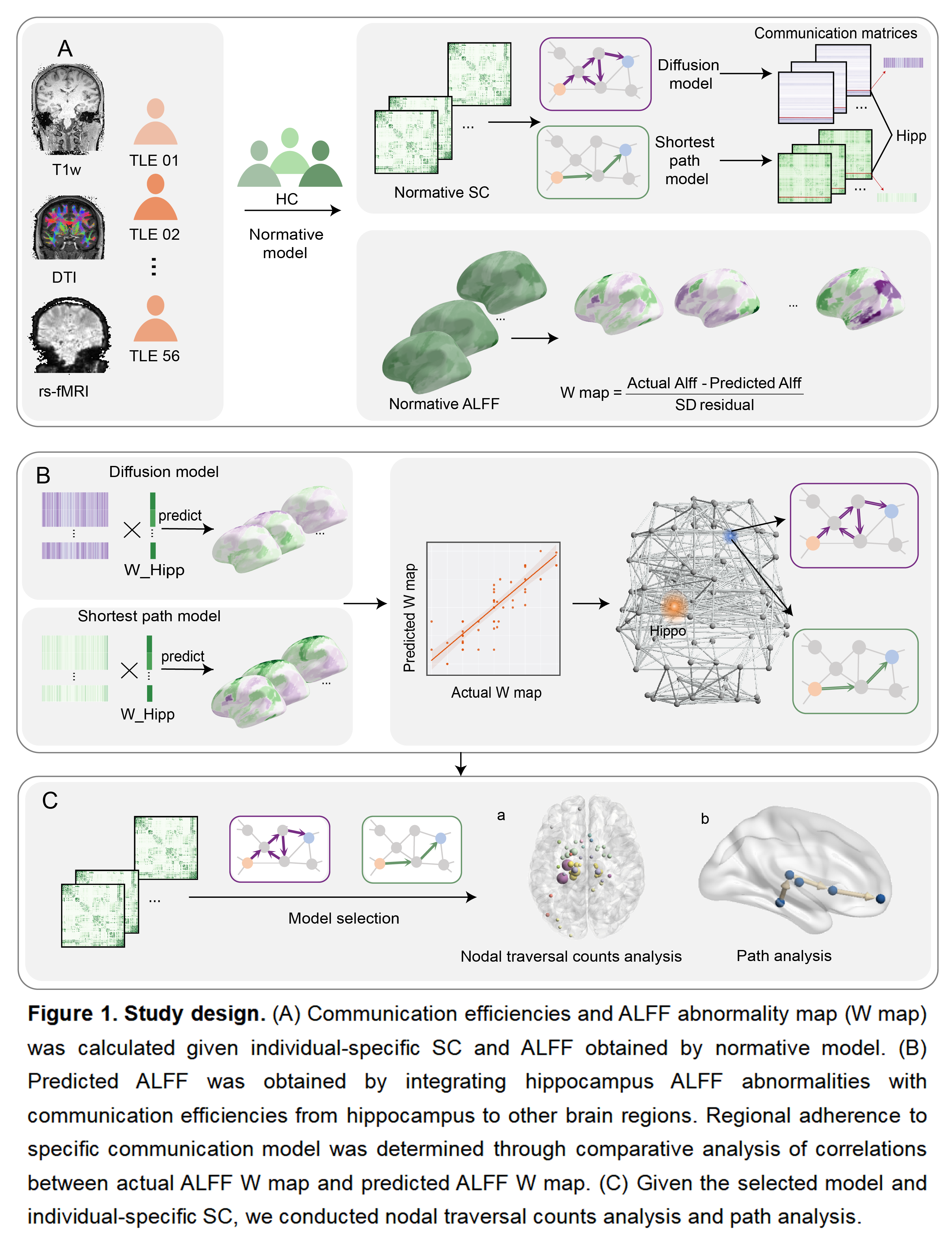 First, normative models were used to obtain individual structural connectivity (SC) and amplitude of low-frequency fluctuation (ALFF) values from healthy controls. These data were subsequently applied to (a) compute communication efficiencies for two communication models (shortest-path and diffusion models) and (b) generate actual ALFF abnormality maps in 56 patients with mesial temporal lobe epilepsy (mTLE). The hippocampus, a predominant epileptogenic focus in mTLE, was selected as the abnormality source. Predicted maps of abnormal ALFF were generated by integrating source abnormalities with communication efficiencies from source to other brain regions. Then, the regional adherence to specific model was determined through comparing correlations between actual and predicted ALFF abnormalities under dual models. Furthermore, the node-wise traversal counts were quantified to identify epileptogenic hub regions in two models. Last, the propagation path from the hippocampus to the orbitofrontal cortex was identified, which served as a prototypical target for path analysis.
