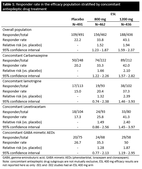 Rationale: Theoretically, antiepileptic drug (AED) combinations with the same mechanism of action may be less adequate than targeting different mechanisms of action. It remains unclear whether AEDs with different mechanisms of action are more likely to interact synergistically than AEDs with similar mechanisms. The aim of this exploratory post hoc analysis was to evaluate efficacy and safety of eslicarbazepine acetate (ESL) as adjuvant therapy to concomitant carbamazepine (CBZ), lamotrigine (LTG), levetiracetam (LEV), or GABA mimetic AEDs (phenobarbital, lorazepam and clonazepam). Methods: BIA-2093-301, -302, -303, -304 were double-blind, randomized, placebo-controlled trials that evaluated efficacy and safety of ESL as add-on treatment in adult patients with focal onset seizures. After an 8-week baseline period, adults with ≥4 focal seizures/month, taking 1–3 AEDs were randomized to placebo, ESL 400 mg, ESL 800 mg or ESL 1200 mg QD (2-week titration; 12-week maintenance). Data from patients treated with concomitant CBZ, LTG, LEV, or GABA mimetic AEDs were pooled. Efficacy (responder rate: ≥50% reduction in seizure frequency) and safety [incidence of treatment emergent adverse events at least possibly related (TEAE); discontinuation due to TEAE] were evaluated in subgroups of patients (not mutually exclusive) treated with concomitant CBZ, LTG, LEV, or GABA mimetic AEDs. Results: Efficacy and safety population included 1389 and 1699 patients, respectively. At baseline, most patients were treated with 1 or 2 AEDs; concomitant CBZ in 682 (49.1%), LTG in 308 (22.2%), LEV in 277 (19.9%) and GABA mimetic AEDs in 201 (14.5%). In the overall population, responder rate was 22.2%, 33.8%, 43.1% for placebo, ESL 800 mg, 1200 mg, respectively. In the analysis by concomitant AED, ESL was associated with higher responder rate (vs. placebo) as add-on to CBZ (Relative Risk, RR: ESL 800 mg, 1.66; ESL 1200 mg, 2.10); LTG (ESL 1200 mg, 2.39); LEV (RR: ESL 1200 mg, 2.40); GABA mimetic AEDs (RR: ESL 1200 mg: 1.87). ESL 1200 mg and concomitant LEV and LTG had the highest association with responder rate (Table 1). Overall, most frequent TEAE were dizziness (20.7%), somnolence (12.9%), nausea (8.3%); most frequent TEAE leading to discontinuation were dizziness (5.6%), nausea (3.1%), vomiting (2.8%; Table 2). ESL as add-on to treatment regimens containing LEV had the lowest frequency of TEAE such as dizziness (13%), somnolence (8.7%), nausea (6.3%), diplopia (3.9%), blurred vision (4.3%), ataxia (1.4%), vertigo (0,5%); lowest frequency of discontinuation due to TEAE such as dizziness (2.9%), nausea (1.4%), ataxia (1.4%), blurred vision, vertigo, vomiting (0%). ESL as add-on to treatment regimens containing CBZ had the highest frequency of TEAE and discontinuation due to TEAE. Conclusions: In this exploratory post hoc pooled analysis of four double-blind, pivotal phase III studies, ESL was efficacious and well tolerated as add-on treatment to CBZ, LTG, LEV and GABA mimetic AEDs in adult patients with focal seizures. ESL as add-on to treatment regimens containing LEV appeared to be associated with lower incidences of some TEAEs. These results should be interpreted with caution due to the exploratory nature of the analysis and because analysis categories were not mutually exclusive. Funding: Studies funded by BIAL and Sunovion Pharmaceuticals Inc.; analyses funded by BIAL