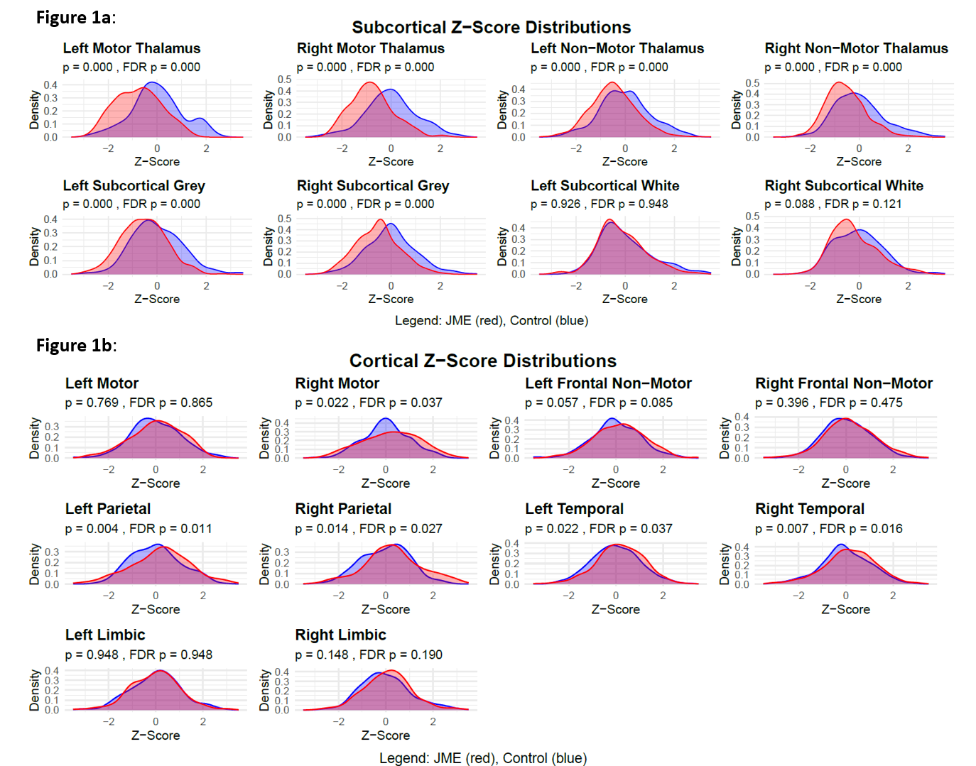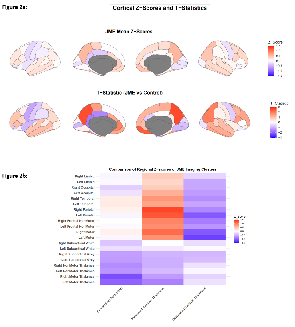 In JME there were reduced subcortical volumes most prominently in motor-related thalamus (p< 0.001) and greater variability in cortical thickness in the frontal/parietal regions. Three endophenotypes