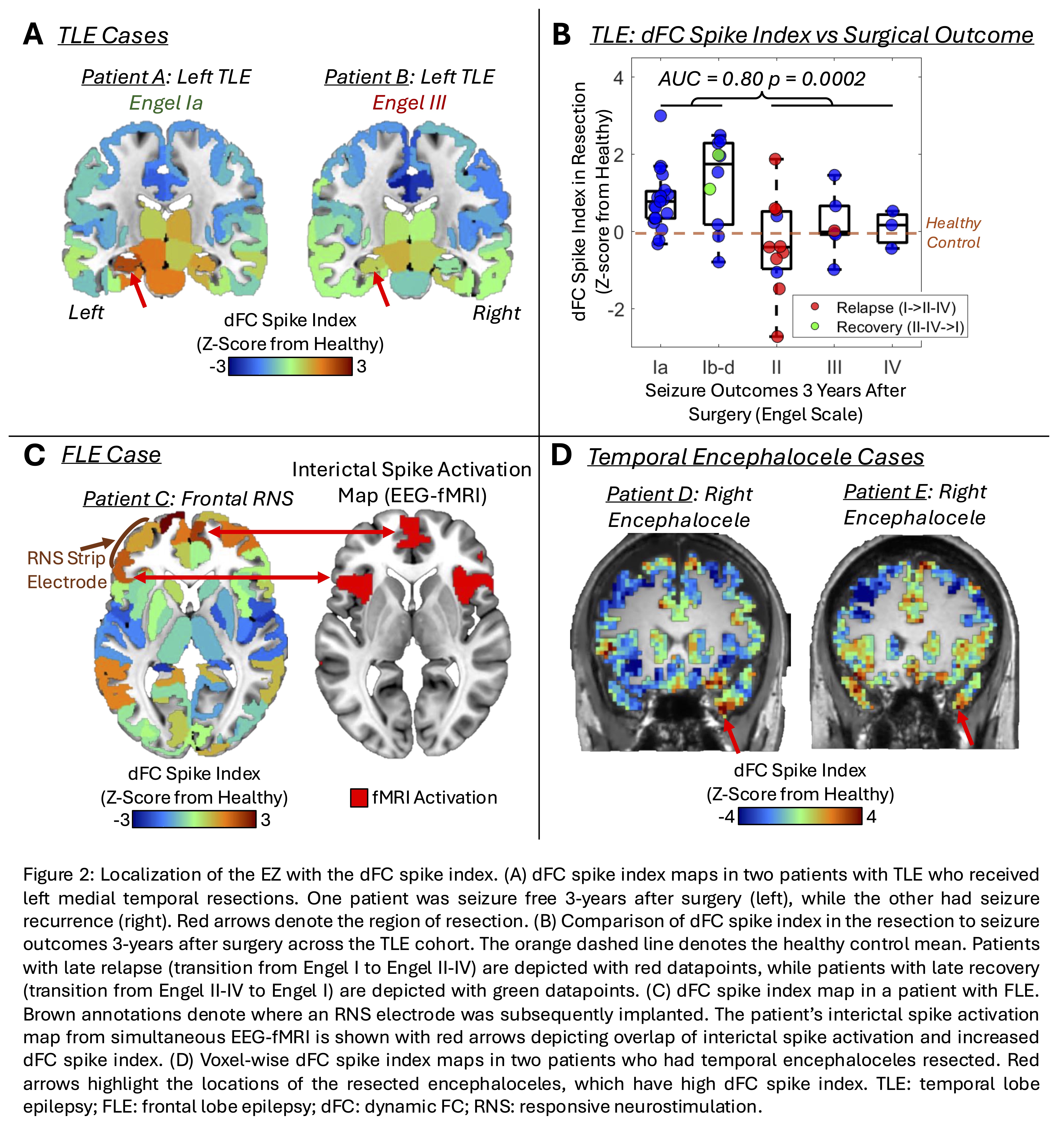 To test if the locations of increased dFC spike index in TLE corresponded to the EZ, dFC spike index was compared between TLE and controls prior to Z-scoring at each region using Wilcoxon rank-sum tests with correction. Next, area under the ROC curve (AUC) analysis determined if patients who were free from disabling seizures 3 years after surgery (Engel I) had higher dFC spike index in their resections than patients who were not (Engel II-IV), since seizure freedom indicates that the EZ was resected. To test whether dFC spike index was increased in the EZ of the case studies, treatment locations were compared to dFC spike index maps.