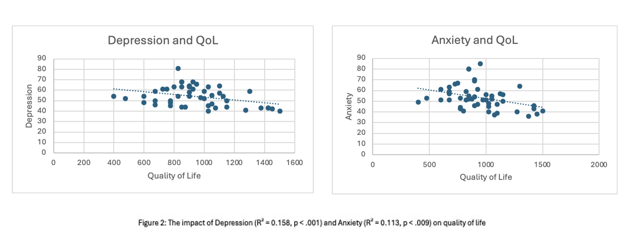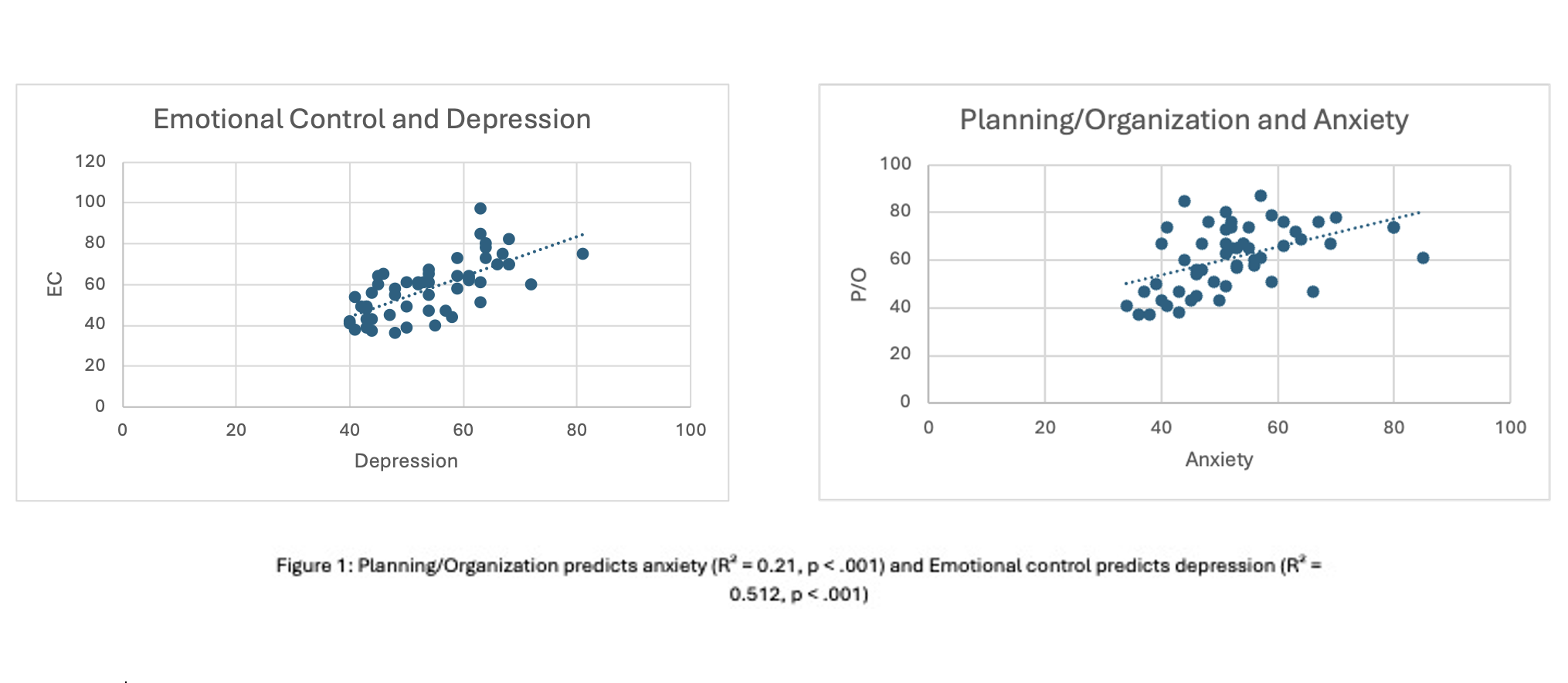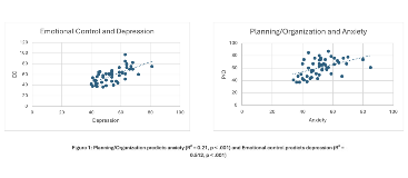 Results: Emotional control was the strongest predictor of depressive symptoms (R² = 0.512, p < .001). Behavioral regulation, working memory, and monitoring also showed moderate associations (R² = 0.26–0.30, all p < .001). For anxiety, planning/organization was the strongest predictor (R² = 0.21, p < .001), followed by working memory, initiation, and monitoring (R² = 0.15–0.19, all p < .01). For QoL, initiation was the strongest predictor (R² = 0.370, p < .001), followed by planning/organization and behavioral regulation (R² = 0.27–0.30, all p < .001). Additional domains—including emotional control, metacognition, and shift—were moderately linked to QoL (R² = 0.21–0.26, p < .01). Depression and anxiety were also independently associated with lower QoL (R² = 0.158 and 0.113, p < .001 and p < .009, respectively).