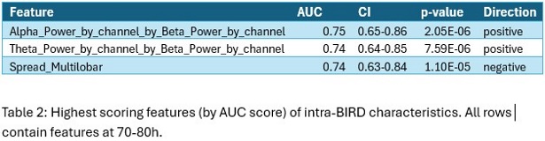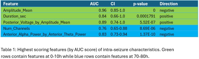 Continuous scalp EEG recordings from post-cardiac arrest patients were analyzed at two time intervals: early (0–10 hours) and late (70–80 hours) post-resuscitation. Data was sourced from the publicly available ICARE dataset. Ictal bursts were classified as seizures, BIRDs, SW, etc. in accordance with ACNS guidelines. We extracted multiple quantitative EEG (qEEG) features, including amplitude, spectral power by region, duration, and channel spread. For single-feature analysis, ROC curves were fit for each single feature of interest independently and AUC calculated. A p< 0.001 was considered significant for AUC >0.5. AUC ≥ 0.7 was considered to indicate prognostic utility.