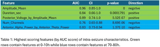At 0-10h, high seizure amplitude strongly predicted poor outcome (AUC 0.96), while longer seizure duration paradoxically predicted better outcome (AUC 0.84). Posterior-predominant seizures at 0–10h were associated with good outcome (AUC 0.89), Spectral content had limited prognostic value at 0-10h. At 70–80h, seizure duration and amplitude were less informative. However, a greater cortical spread involved predicted poor outcome (AUC 0.76). Anterior-dominant alpha/theta power within seizures at 70-80h predicted favorable outcome (AUC 0.83). For BIRDs, widespread involvement predicted poor outcome at 70-80h (AUC 0.74), while higher alpha/beta and theta/beta power correlated with better outcomes (AUC 0.75) and (AUC 0.74) respectively. For spike-and-waves at 0-10h, longer duration was favorable (AUC 0.76), while greater amplitude and spikiness were associated with worse outcomes (AUC 0.68, 0.66). Increased intra-burst alpha, alpha/delta, and alpha/theta ratios at 0-10h also predicted poor outcome (AUC 0.69, 0.72, 0.75), though these effects diminished at 70-80h.Conclusions: