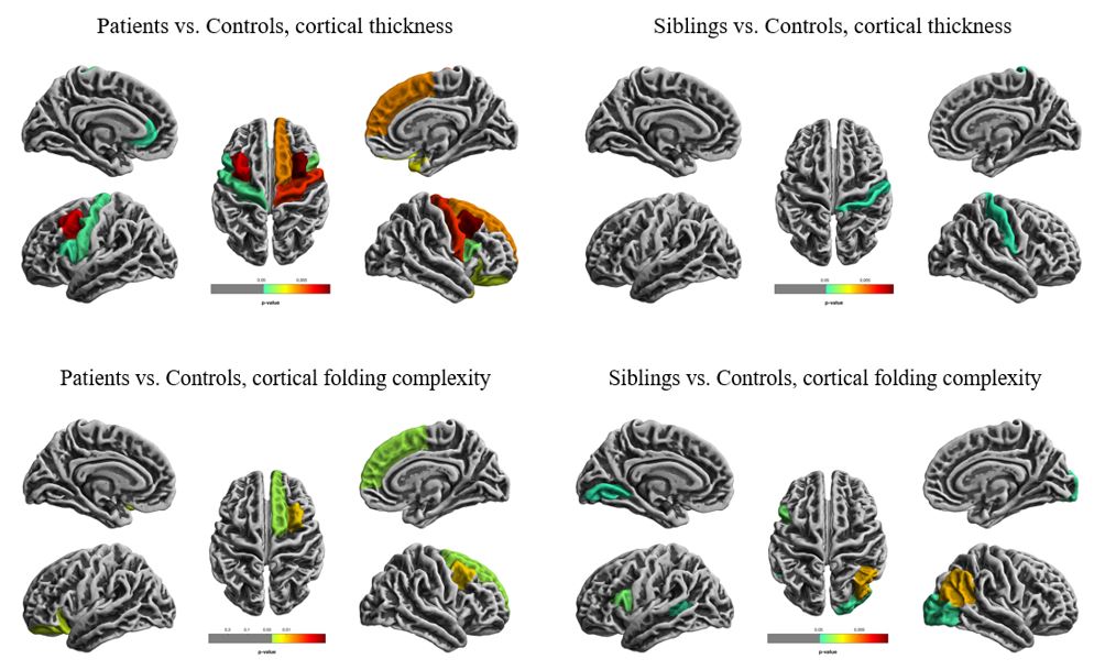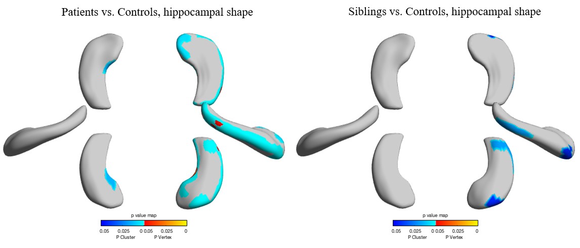 Rationale: Hippocampal and extrahippocampal structural abnormalities are frequently observed in temporal lobe epilepsy (TLE). The pathological mechanisms of these neuroimaging findings are not well understood. We aimed to define the genetic contribution to these neuroimaging traits by identifying shared morphological abnormalities in TLE patients and their asymptomatic siblings. Methods: We collected clinical, electrophysiological, and high-resolution structural neuroimaging data of 18 sporadic non-lesional TLE patients (12 right TLE, 6 left TLE), their 18 unaffected full siblings, and 18 matched healthy volunteers. We compared overall hippocampal volumes between groups and determined the subregional extent of hippocampal abnormalities using shape analysis, and whole-brain differences in cortical thickness and folding complexity. We corrected analyses for age, sex, level of education, and results of neuropsychological testing. Results: We detected significant (p<0.01) differences of hippocampal volumes in both groups, patients (left TLE: median volume ipsilateral hippocampus 2.23ml; interquartile range (IQR) 2.11-2.28; right TLE: ipsilateral hippocampus 1.92ml, IQR: 1.57-2.59) and their unaffected siblings (left hippocampus 2.47, IQR: 2.29-2.65; right hippocampus 2.65, 2.32-2.76) compared to healthy controls (left 2.82, 2.56-2.98; right 2.94, 2.77-3.24). Shape analysis demonstrated significant (p<0.05, corrected for multiple comparisons) subregional atrophy of both hippocampi (right>left) in TLE patients compared to healthy controls. The right lateral body and anterior head of the hippocampus were predominantly affected, corresponding to the right CA1 subfield and subiculum. Similarly, significant subregional atrophy was detected in siblings vs. controls, affecting the right lateral body and anterior head of the hippocampus, mainly involving the right CA1 subfield. Reduced cortical thickness in TLE patients was observed in the pericentral, frontal, and temporal areas, whereas cortical thinning was restricted to the right postcentral gyrus in unaffected siblings (p<0.05). Both TLE patients and asymptomatic siblings showed increased cortical folding complexity but in a diverging spatial distribution (predominant frontal in patients; predominant parieto-occipital in siblings; p<0.05). Conclusions: We detected shared hippocampal and cortical morphological abnormalities in TLE patients and their unaffected siblings. Our results suggest a shared genetic vulnerability that could represent a neuroimaging endophenotype of TLE, which might precede the onset of epilepsy in these individuals. Funding: National Natural Science Foundation of China (NSFC:81671300), Research Project of the Ministry of Science and Technology of China (2016YFC0904400), Xiangya Hospital Clinical Project (No. 2016L08)