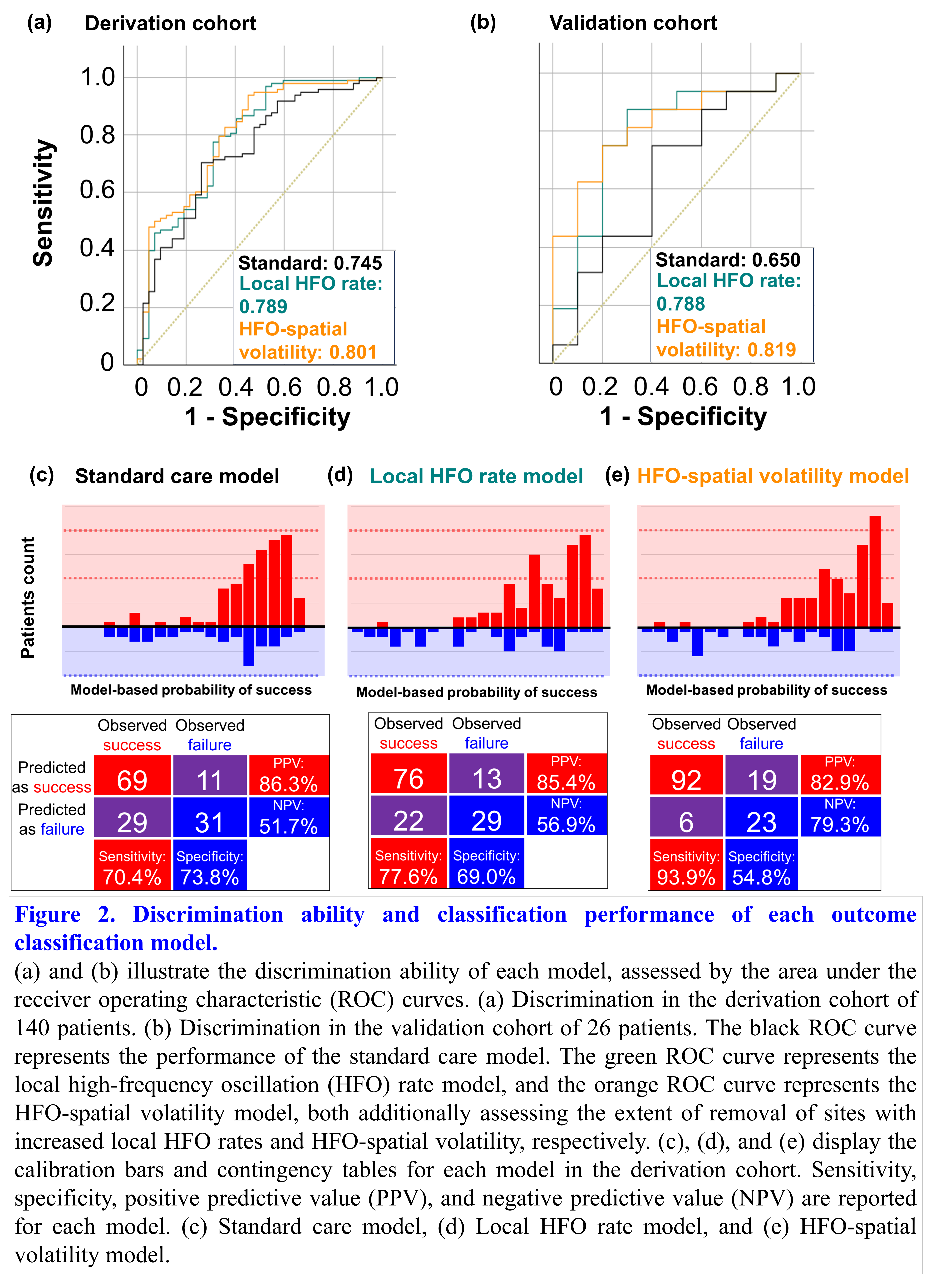 In the derivation cohort (140 patients, 14,933 electrode sites; mean age: 13.1 years old (range: 4-44); female: 68 [48.6%]; seizure freedom: 98 [70.0%]), greater local HFO rate and HFO-spatial volatility in resected areas independently contributed to predicting seizure freedom. Adding HFO-spatial volatility to the standard care prediction model (HFO-spatial volatility model) significantly improved its performance (AUROC increased from 0.745 to 0.801; p = 0.034), whereas adding local HFO rate (local HFO rate model) did not yield a significant improvement (AUROC increased to 0.789; p = 0.098) (Figure 2). In an independent validation cohort (26 patients, 1,626 electrode sites; mean age: 25.7 years old (range: 12-42); female: 14 [53.8%]; seizure freedom: 16 [61.5%]), the HFO-spatial volatility model similarly improved predictive performance (AUROC increased from 0.650 to 0.819; p = 0.020), while the local HFO rate model again failed to show significance (AUROC increased to 0.788; p = 0.053).