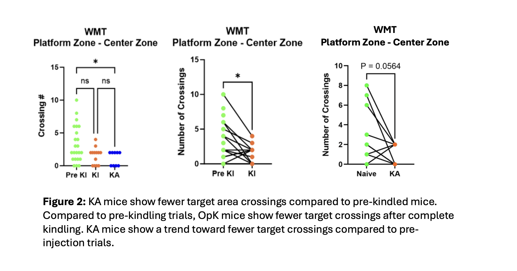 We used an OpK model of mTLE (n=14) to induce progressively severe and generalized seizures. Intra-hippocampal kainic acid-injected mice (KA) (n=10) served as a model for chronic mTLE, with naïve mice (n=12) as controls. Morris water maze (WMT) and novel object recognition (NORT) tests were conducted to investigate changes in spatial learning and memory during kindling progression.